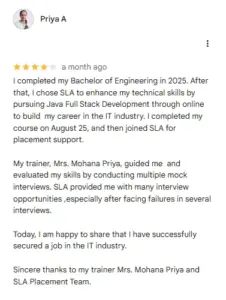 SLA Manager Career Upgradation Related postsGoogle Review 190June 4, 2024Google Review 475March 21, 20262025-Dec-Placement post-806December 26, 2025 Leave the first comment (Cancel Reply)Name * Email * Website Save my name, email, and website in this browser for the next time I comment. Comment * Previous post2025-March-Placement post-85Next post2025-March-Placement post-87